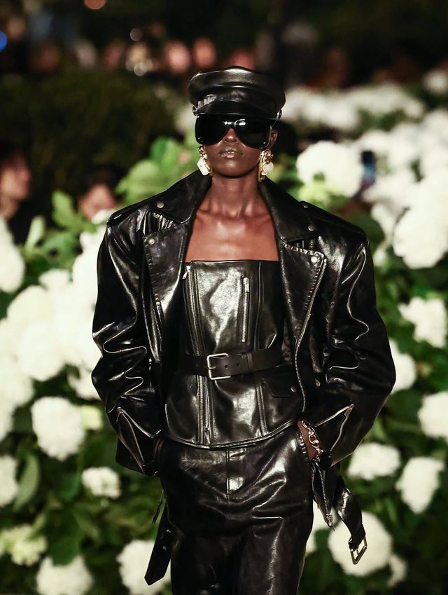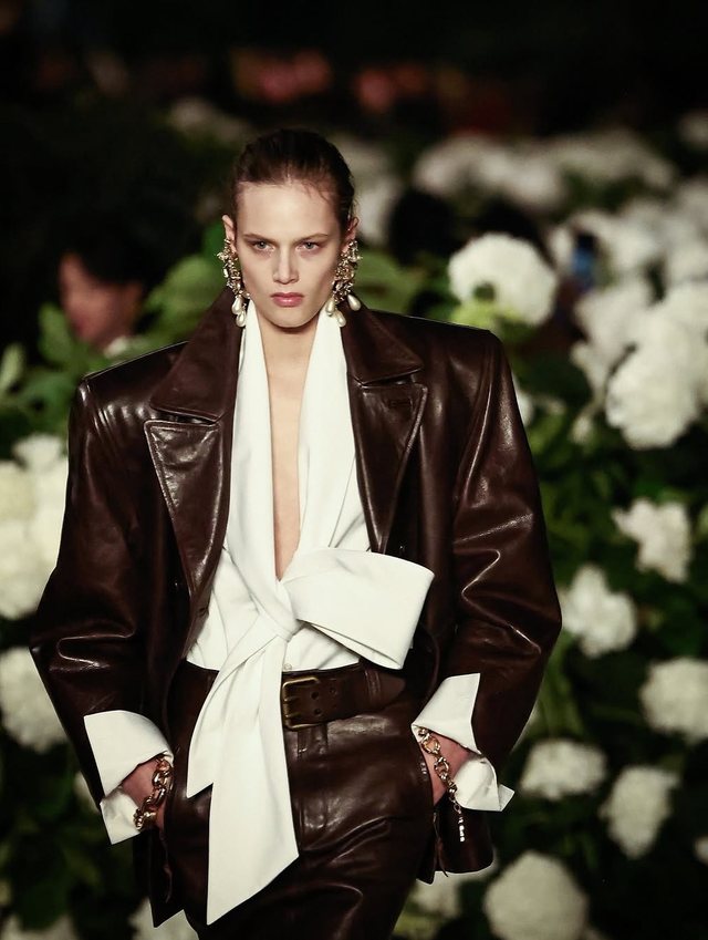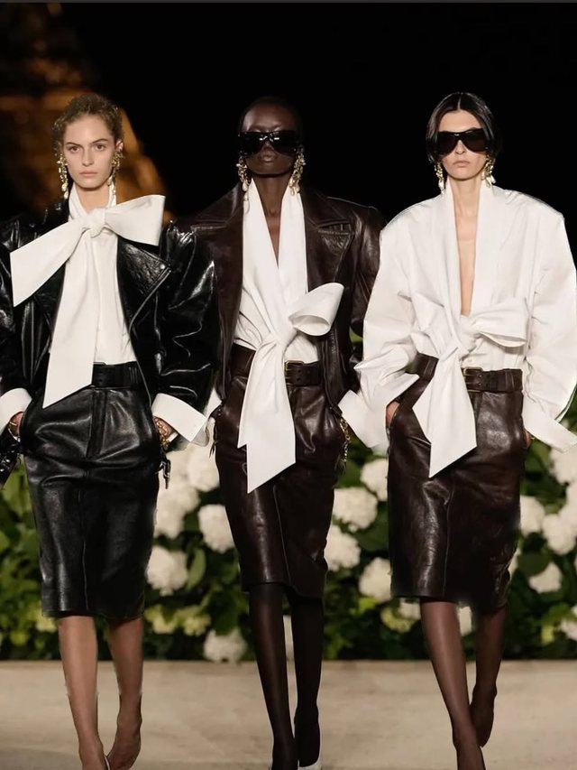 Një prej elementëve që mori vëmendje ishte përdorimi i xhaketave të lëkurës me volum të rëndë dhe bluza prej poplini të bardhë që binin në kontrast.