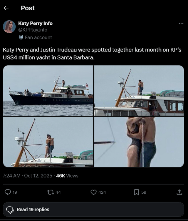 Tani, duket se Perry e ka lënë pas atë kapitull dhe ka gjetur lumturinë me Trudeau. Fotot e publikuara nga Daily Mail i tregojnë të dy duke shkëmbyer përqafime dhe puthje në jahtin 24-metërsh të këngëtares, Caravelle, pranë brigjeve të Santa Barbarës, Kaliforni.