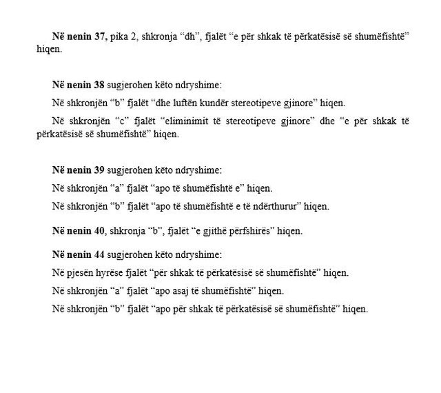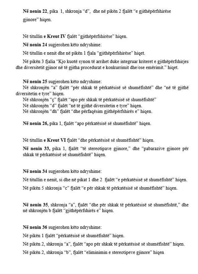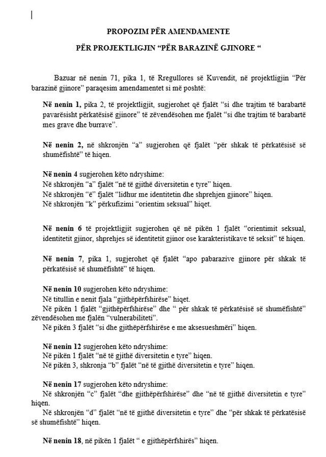 Në amendamente sugjerohet që fjalët “si dhe trajtim të barabartë pavarësisht përkatësisë gjinore” të zëvendësohen me fjalët “si dhe trajtim të barabartë mes grave dhe burrave”.