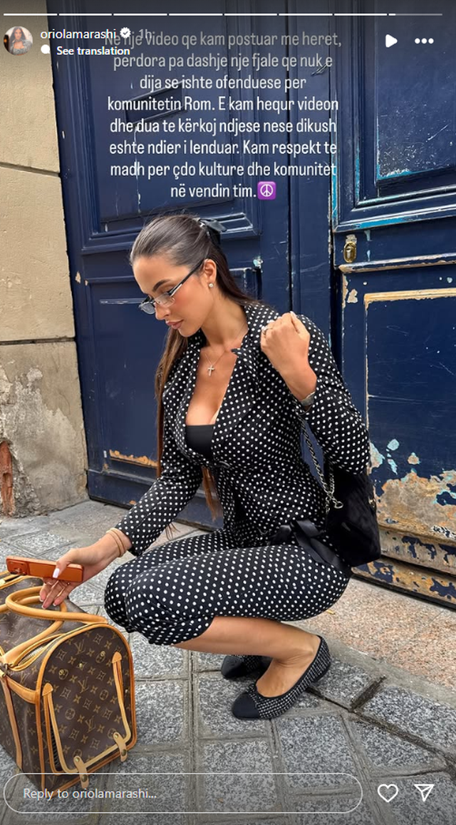 “Në një video që kam postuar më herët, përdora pa dashje një fjalë që nuk e dija se ishte ofenduese për komunitetin Rom. E kam hequr videon dhe dua të kërkoj ndjesë nëse dikush është ndier i lënduar. Kam respekt të madh për çdo kulturë dhe komunitet në vendin tim,” – shkroi ajo.