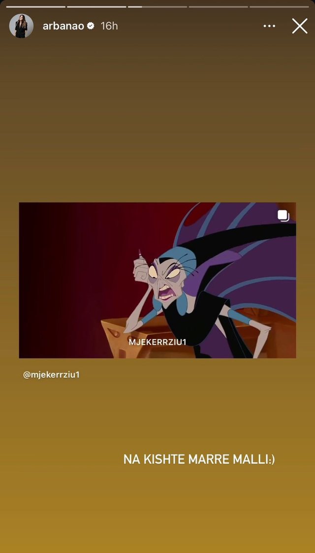 Në një story në Instagram, moderatorja ndau një video nga faqja humoristike @mjekërrziu1, ku përdoren zëra dhe dialogë nga emisione shqiptare mbi skena të animuara me kukulla.
