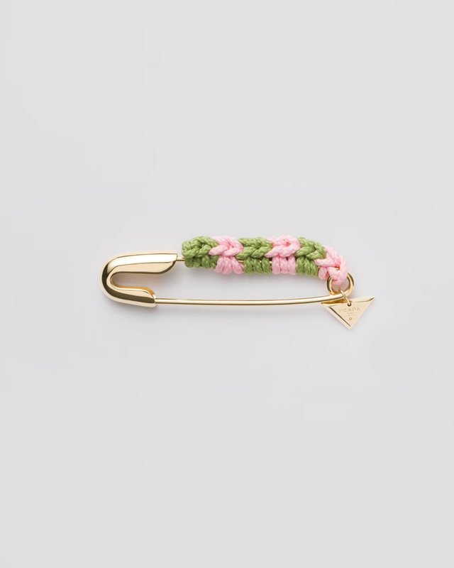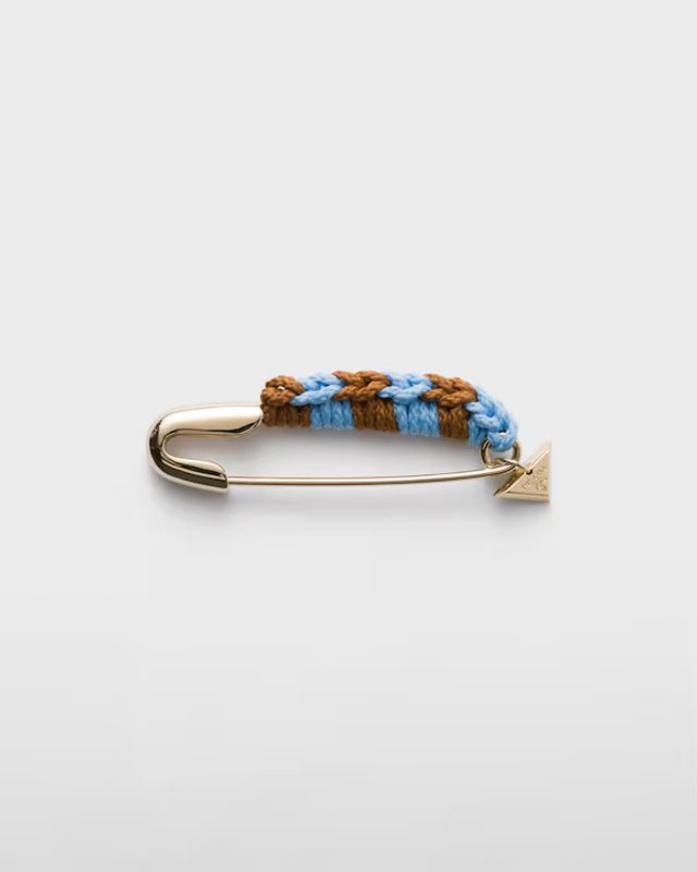 Spila në fjalë është ngjyrë ari (por jo prej ari të vërtetë), e zbukuruar me disa fije shumëngjyrëshe që e bëjnë më dekorative. Mund të vendoset në jakën e një xhakete apo në një çantë. një detaj i vogël që, sipas Pradës, kthehet në shenjë stili dhe identiteti.