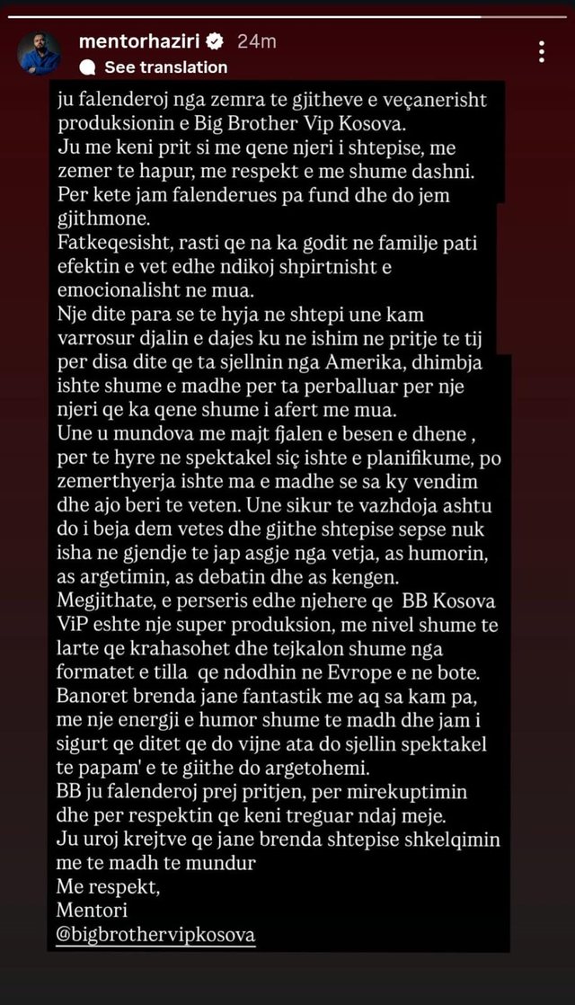 Largimi i menjëhershëm i Mentor Hazirit nga shtëpia më e famshme në Kosovë, pa kaluar as 24 orë nga hyrja e tij, ngriti shumë pikëpyetje te publiku. Mbrëmë, këngëtari vendosi të flasë hapur dhe të tregojë arsyen e vërtetë, një histori dhimbjeje që qëndron shumë larg lojës dhe strategjive televizive.