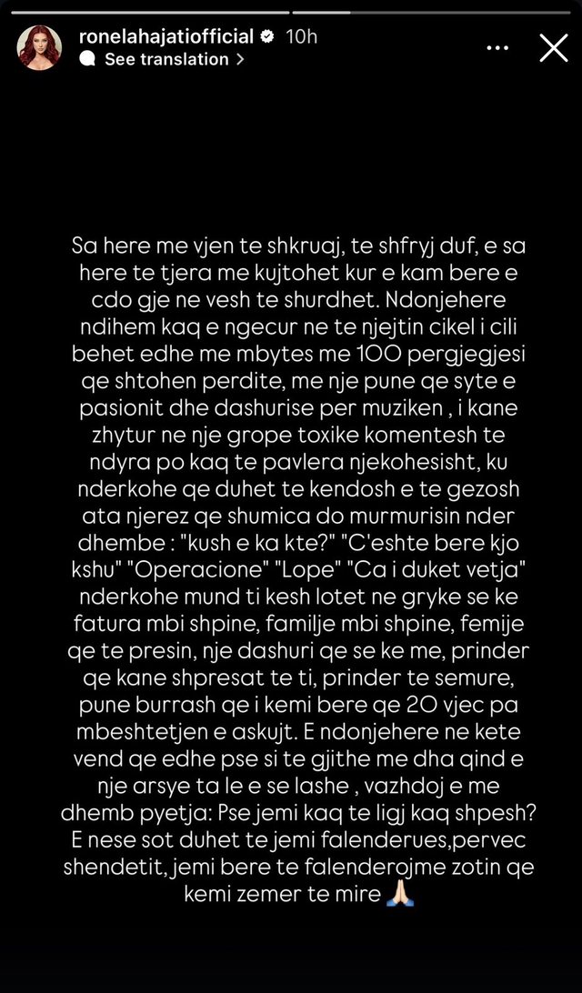 Ronela Hajati ka zgjedhur rrjetet sociale për të shprehur lodhjen dhe zhgënjimin e saj nga gjuha e ashpër dhe komentet fyese që merr prej vitesh. Në një shkrim të gjatë në Instastory, këngëtarja tregon se nuk është më e zemëruar, por e konsumuar emocionalisht nga një cikël që duket se përsëritet pa fund.