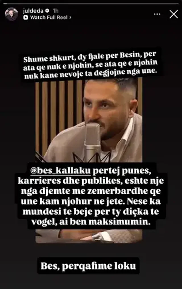 “Përtej punës, karrierës dhe publikut, Bes Kallaku është një nga djemtë me zemër më të bardhë që kam njohur në jetë. Nëse ka mundësi të bëjë për ty diçka të vogël, ai bën maksimumin,” shkruan Jul Deda, krahas videos nga podcasti i Grida Dumës ku i ftuar ishte Besi.