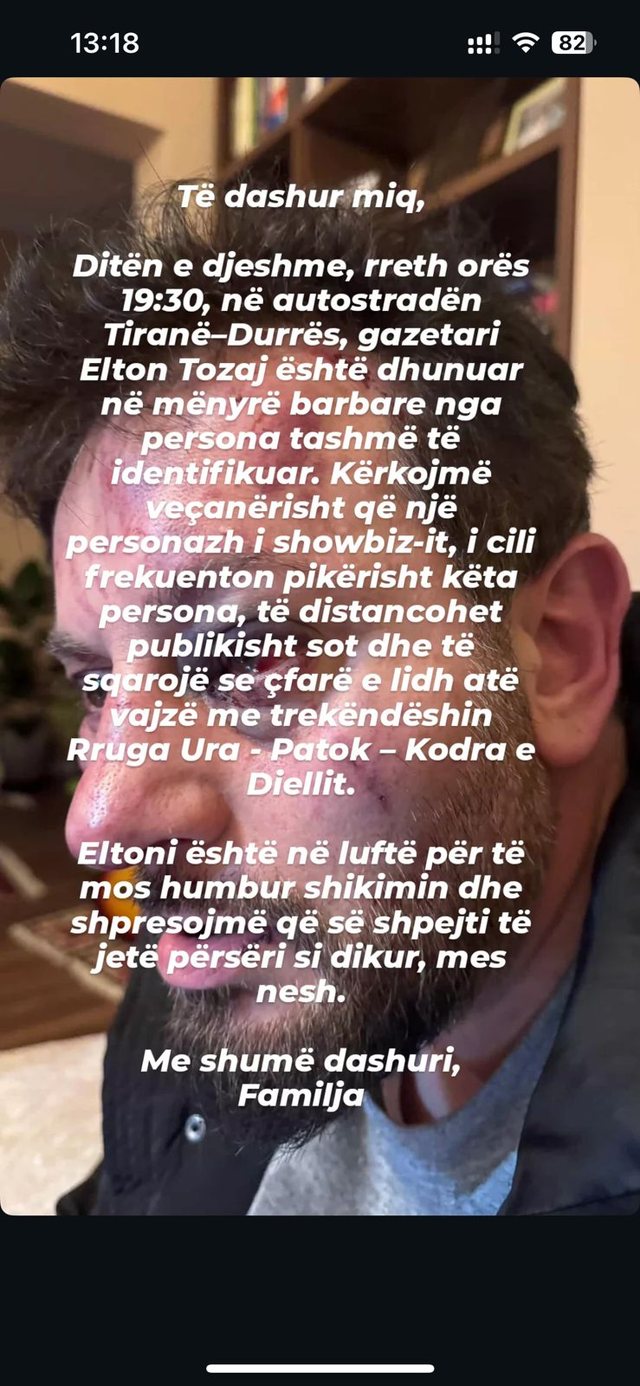 Një ngjarje e rëndë është bërë publike këtë të shtunë, pasi familjarët e gazetarit dhe ish-banorit të “Big Brother Albania”, Elton Tozaj, njoftuan se ai është sulmuar fizikisht dhe ka pësuar dëmtime serioze, duke rrezikuar të humbasë shikimin.