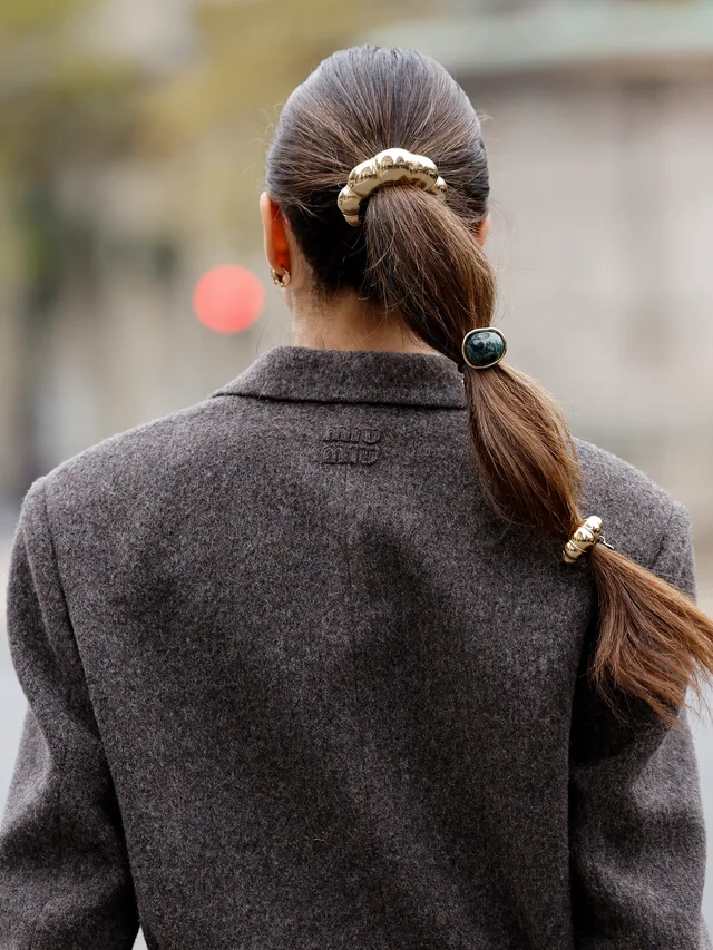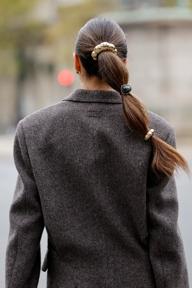 Një nga rikthimet më të dukshme është llastiku që duket si bizhu: me pllakë metalike (e artë/argjendi) apo detaj reflektues. Funksionon shumë mirë për: