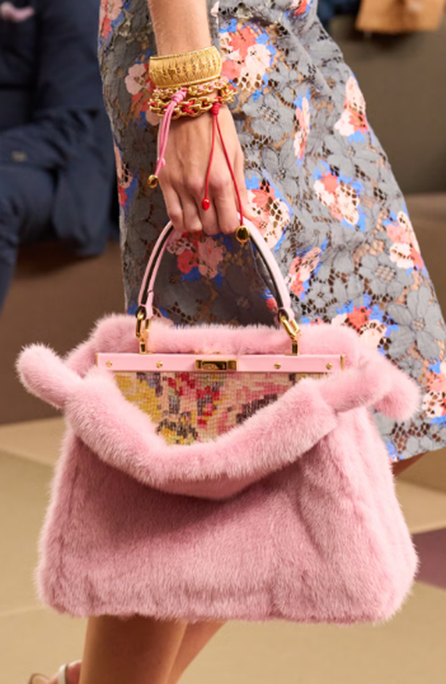 Edhe te Fendi, Peekaboo mbetet e hapur por me një rregull të pashkruar: mos e mbush shumë, se pastaj humbet “magjia” e brendshme, ato detaje luksoze brenda, mes mozaikëve me rruaza shumëngjyrëshe, thekseve lime dhe luleve të vogla tridimensionale. Ndërsa te Dior, historia ndryshon: çanta e re me një dorezë të vetme, e zbukuruar me fjongo, ka në fakt një kapak të brendshëm që e mbulon përmbajtjen. Pra, e hapur jashtë, por e kontrolluar brenda.