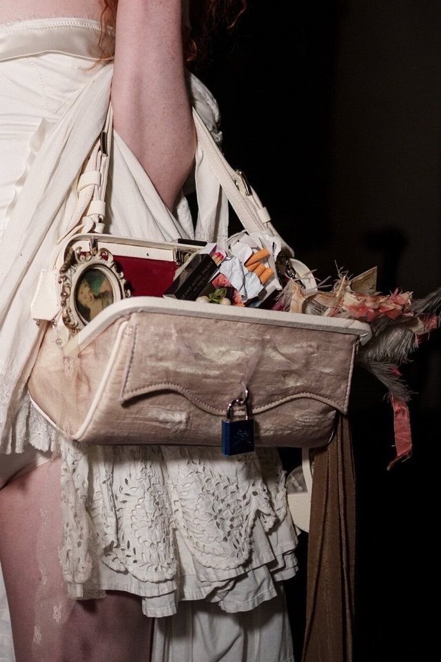 Ndërkohë, Dilara Findikoglu sjell në pasarelë çanta “granny purse” që derdhen nga përmbajtja: nga paketa cigaresh te charms, e deri te detaje që ngjajnë me rripa reçipetash si një homazh për gratë dhe për “jetën e tyre të brendshme”, të vendosur në dritë.