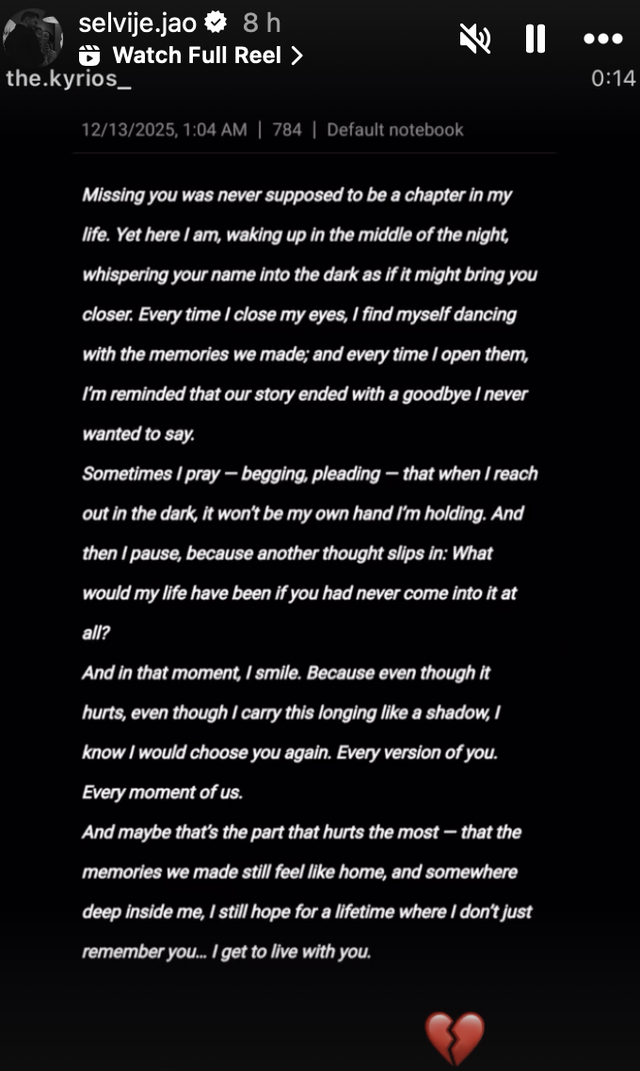 Në rreshtat e ndarë me ndjekësit, Selvija flet për netët kur zgjohet dhe, në errësirë, pëshpërit emrin e tij, me shpresën siç e quan vetë të kotë se kjo mund ta afrojë sado pak me të. Ajo rrëfen se jeta ka marrë një drejtim të papritur, duke e lënë përballë një boshllëku që duket se nuk mbushet me asgjë.