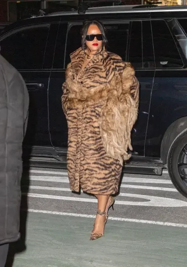 Në qendër të vëmendjes ishte palltoja e trashë prej leshi me print tiger, që vetëm Rihanna di ta veshë pa e tepruar. Ajo e kombinoi me këpucë me rrip te kyçi, po në të njëjtin print, duke e bërë “matching” deri në detaj një lëvizje që ose ta prish, ose ta ngre në nivel ikonik… dhe te Rihanna zakonisht ndodh e dyta.