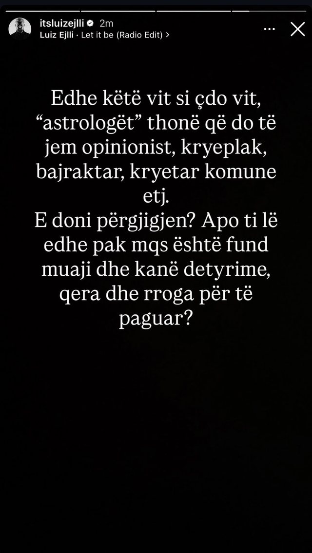 “Edhe këtë vit si çdo vit, ‘astrologët’ thonë që do të jem opinionist, kryeplak, bajraktar, kryetar komune etj. E doni përgjigjen? Apo t’i lë edhe pak meqë është fund muaji dhe kanë detyrime, qera dhe rroga për të paguar?”, shkroi ai.