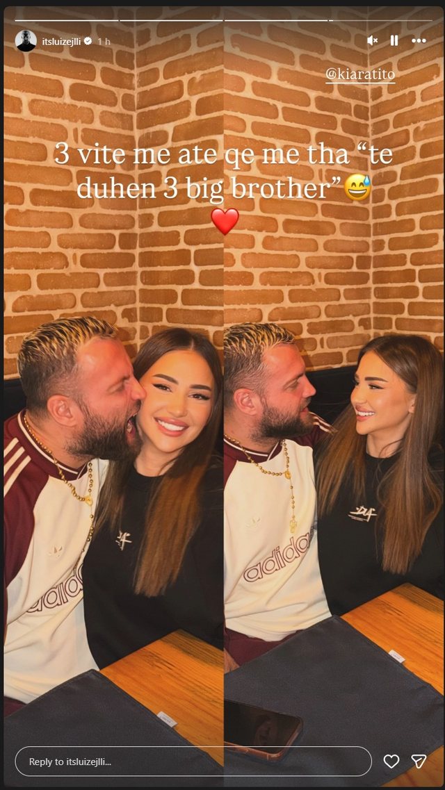 Në një postim në Instagram, ku dyshja shfaqen në momente të afërta dhe romantike, Luizi vendosi ta kthejë sërish në qendër të vëmendjes një prej frazave më të komentuara të Kiarës brenda shtëpisë së famshme.